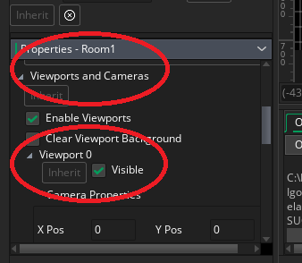 Marque a opção ENABLE VIEWPORTS e também em viewport 0, marque a opção Visible. Ao fazer isso, aparecerá uma quadradro branco na room do seu projeto.